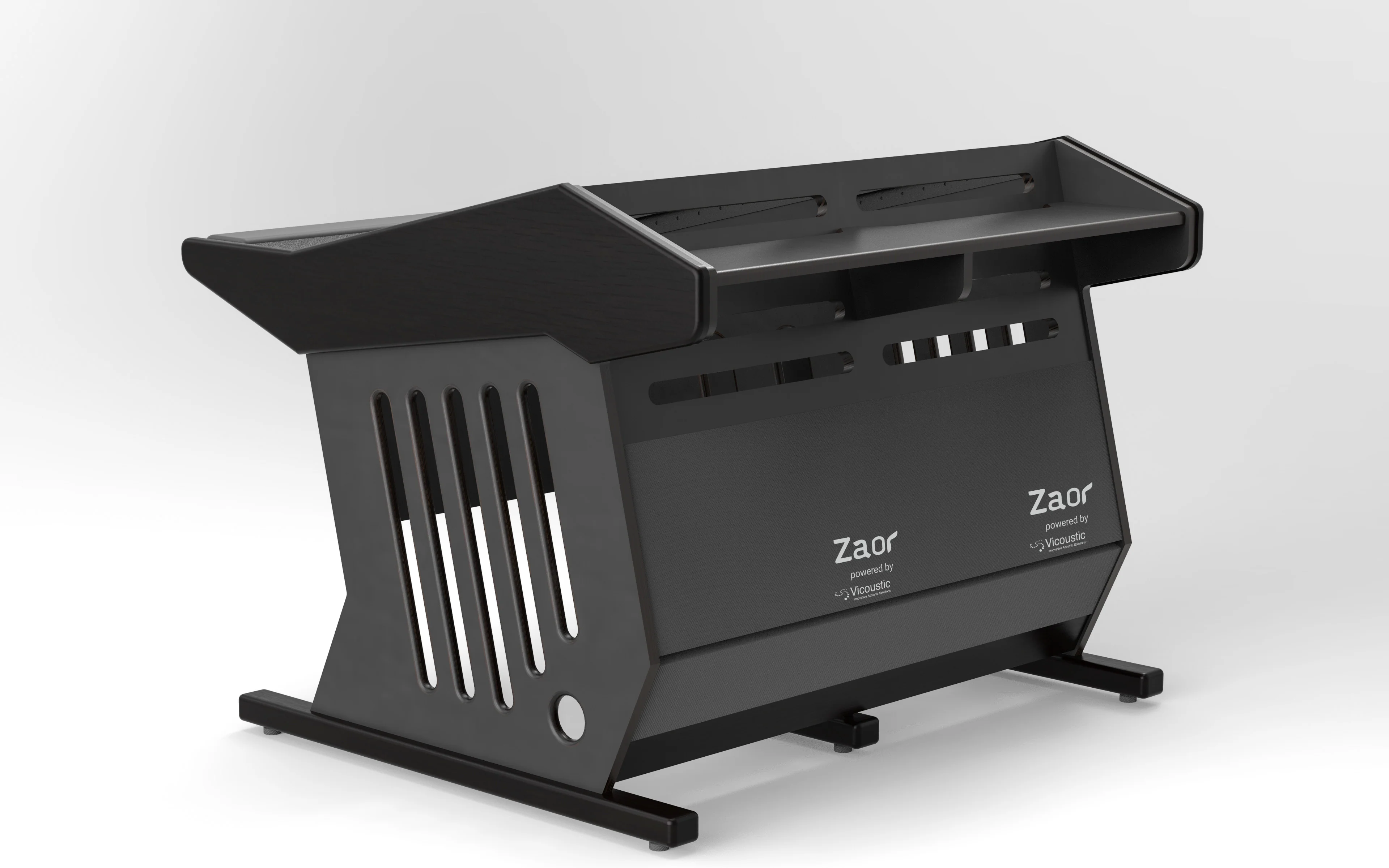 Low-profile, acoustically optimized studio desk. 24 rack spaces in two columns + 12 rack spaces below. Open side panels for optimal airflow and a small sonic footprint: the design avoids acoustic interference, absorption panels on the back and the acoustic felt desktop eliminates comb filter effects. Dual cable management separates power wiring and critical audio connections.