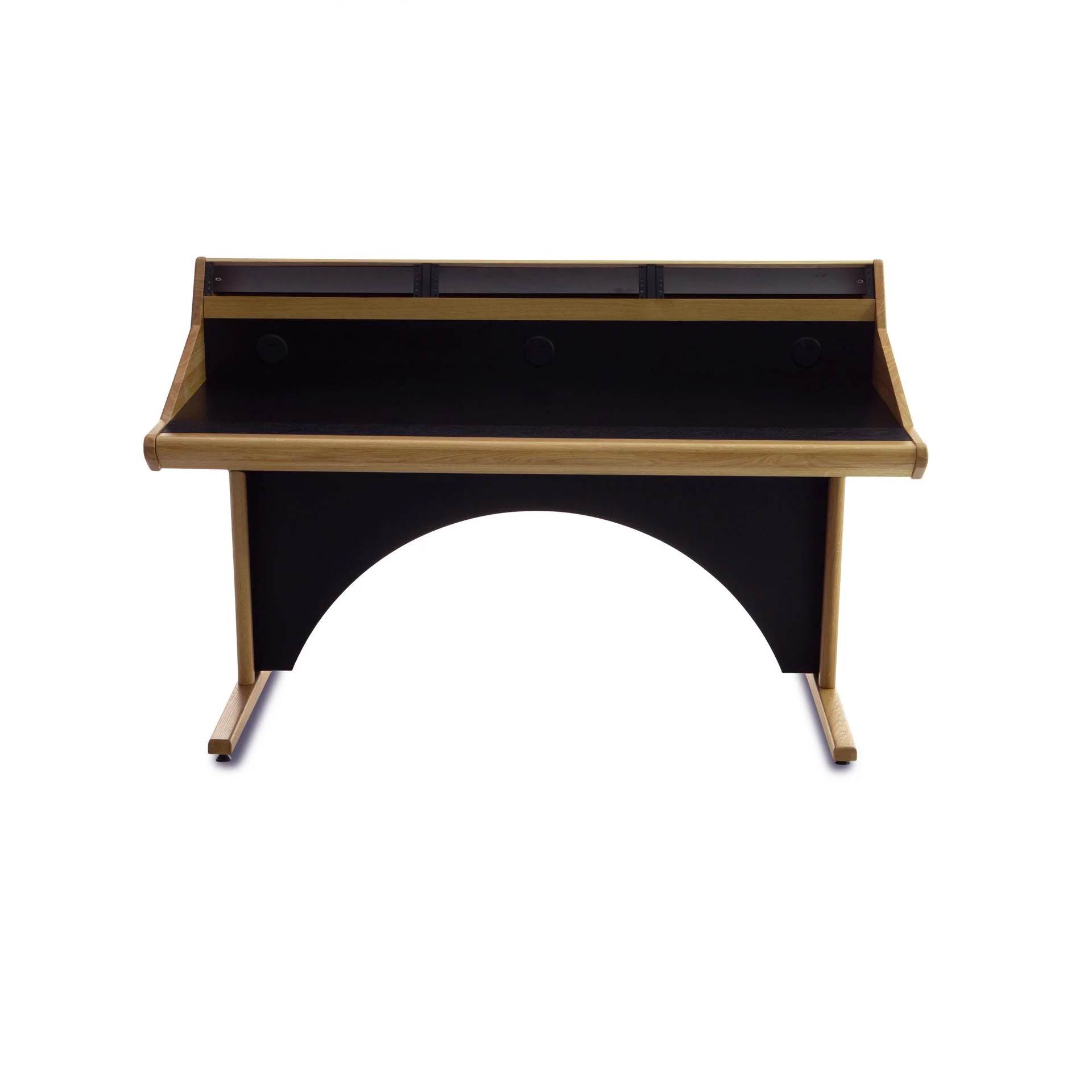 Marea O offers a grand open space for all your small mixers, controllers, drum pads... with a few pieces of outboard gear: Above the desktop you have 3 x 2 RU. . Behind the rack units is a shelf for computer screens and/or monitor speakers. Extensive cable management guarantees a clean setup. The solid wood sides and armrest ooze quality and will outlast most of your gear! You can customise the desktop to integrate your controllers such as the SSL UF8+UF1, Icon or Avid S series plus dock. And if you change your setup, you can simply swap out the desktop with fresh cutouts or none.