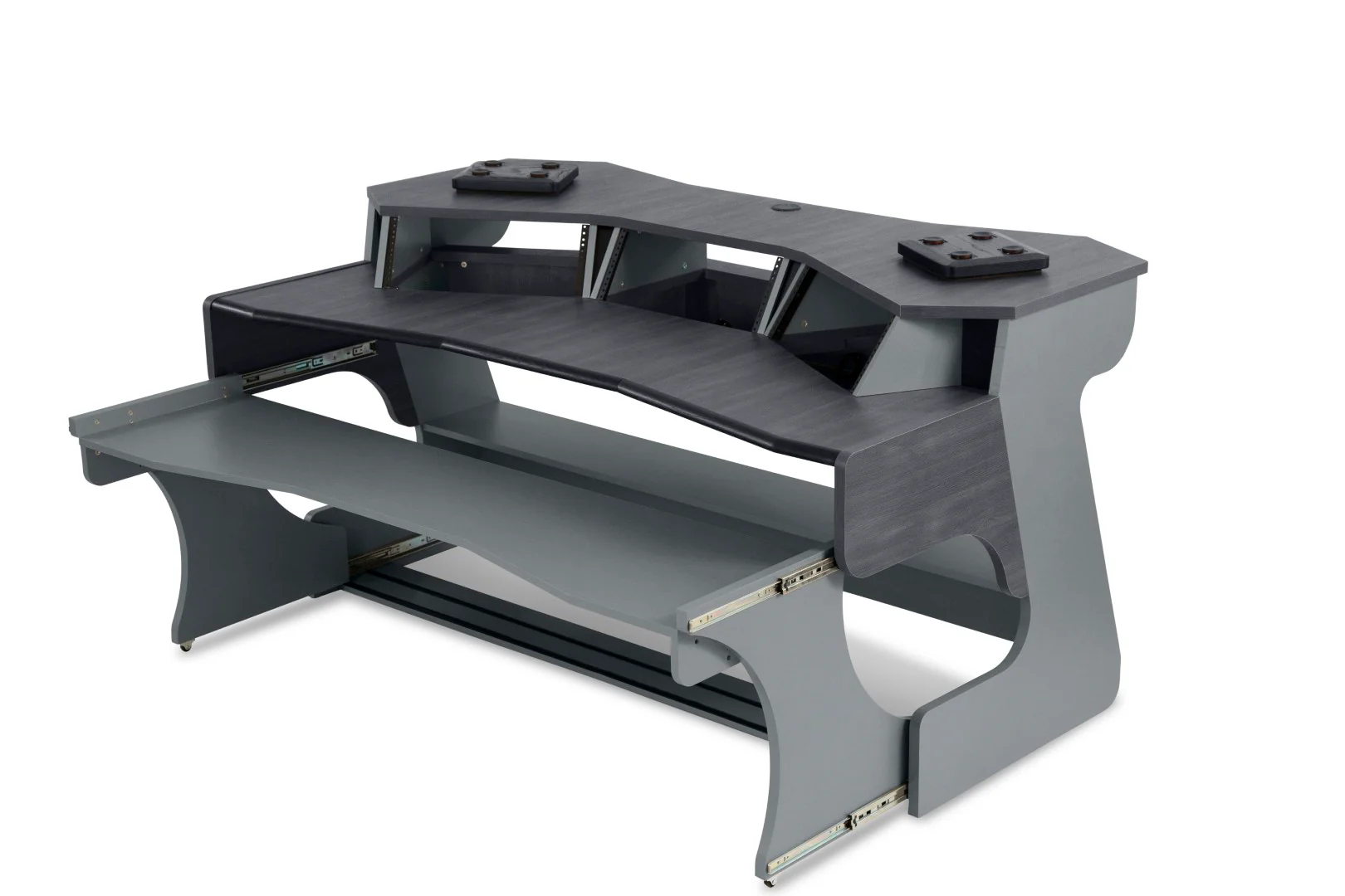 Born from a customer’s wish for their perfect desk, the new Miza X2 FLEX is a testament to the commitment of Zaor to keep improving. It offers 4 levels of space for all your creative tools. There is enough room on the top shelf for multiple computer screens and nearfield monitors, which sit on the included IsoAcoustics speaker isolators. Twelve units of rack space for your preamps, synthesizers, or analog mastering chain and a super wide desktop. Right underneath the main desk sits the height-adjustable heavy-duty keyboard tray carrying 90+ lb – sufficient for even the largest keyboards or controllers. We have optimized the cable management for even more convenience. These features, combined with the solid build and quality make the Miza X2 the ideal cockpit for audio pilots and content creators.